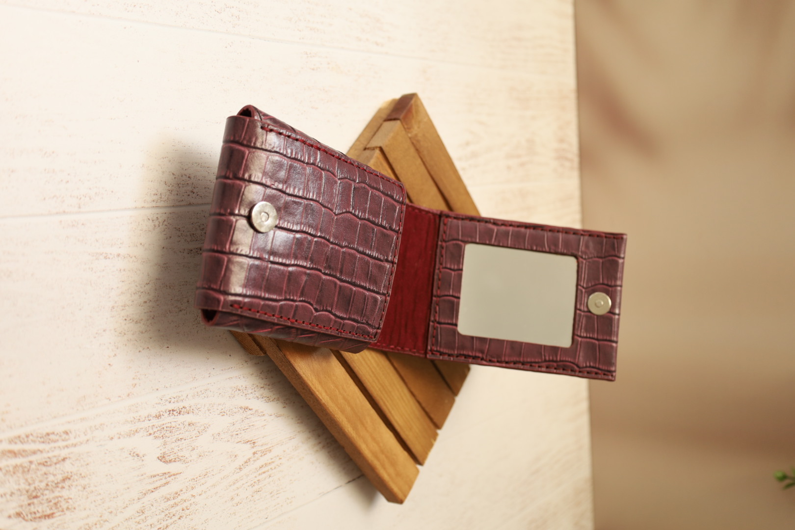 كيف آرايشي آينه دار چرم طبيعي دستدوز دوخته شده با چرم طبيعي گاوي داراي رنگ لبه حرفه اي و تميز مناسب براي كيف دستي، سفر ، روزمره و... قابل سفارش با چرم دلخواه شما
